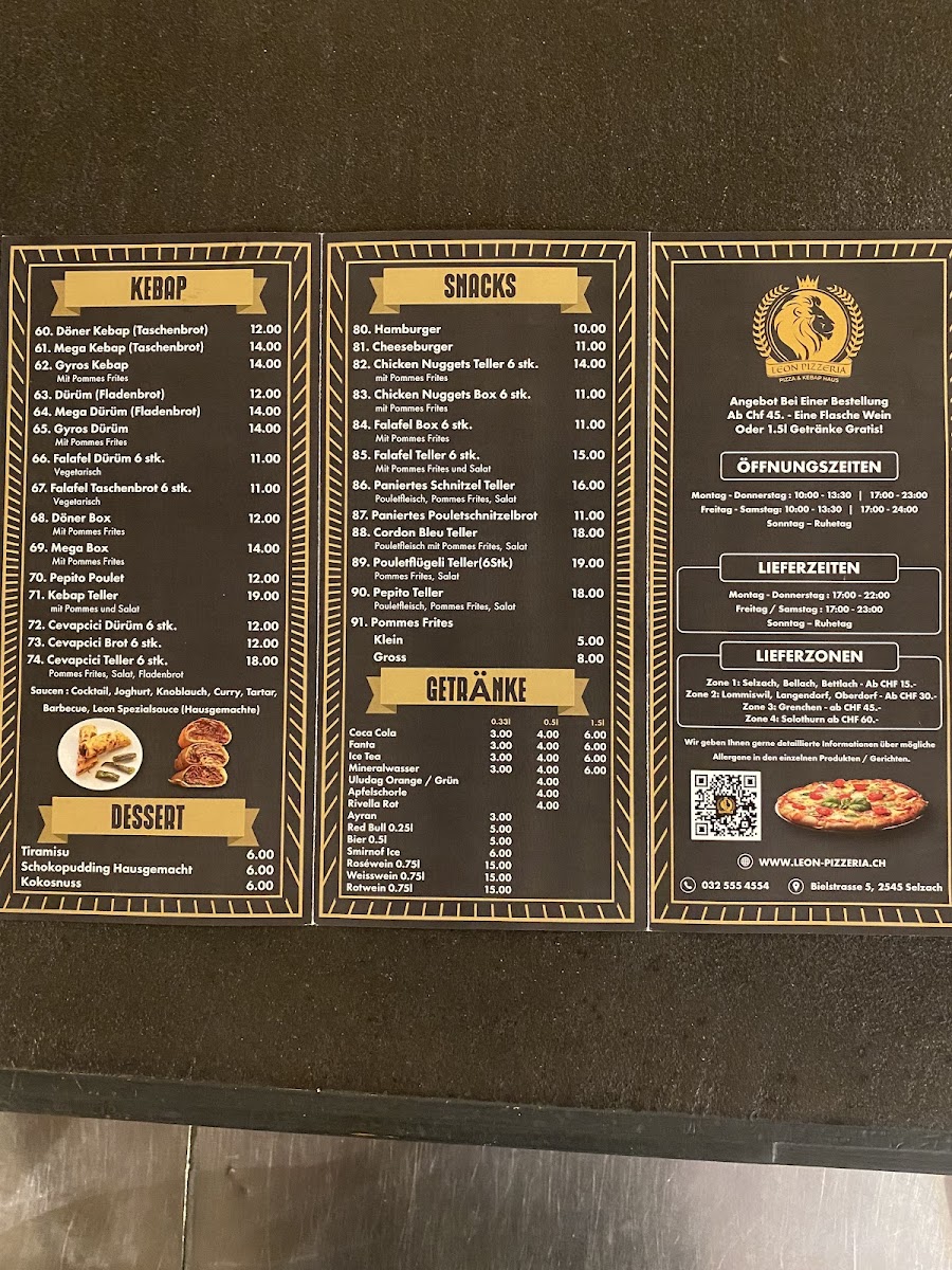 Welcome to Leon Pizza & Kebap Haus, your new favorite culinary haven in Selzach, Switzerland. Nestled on Bielstrasse, this delightful eatery excels in serving authentic kebabs and pizzas that promise to satisfy every late-night craving. The menu features fresh ingredients, with standout items including their renowned kebabs—crafted with tender meat and crispy bread that offer the perfect bite.